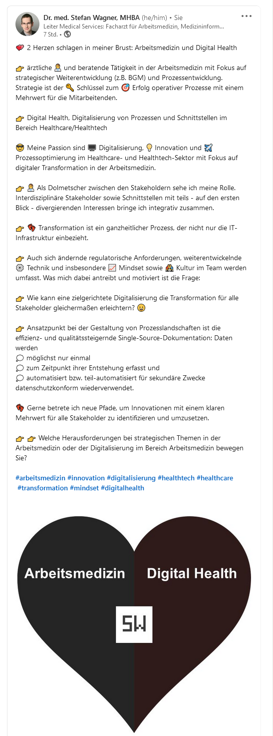 😎 Meine Passion sind 🖥 Digitalisierung, 💡 Innovation und ✈ Prozessoptimierung im Healthcare- und Healthtech-Sektor mit Fokus auf digitaler Transformation in der Arbeitsmedizin.