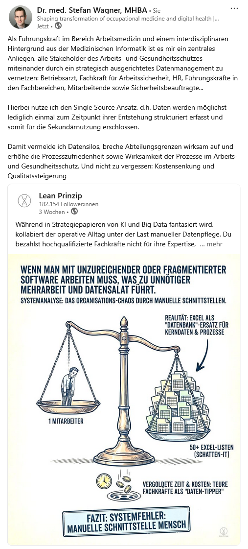 Als Führungskraft im Bereich Arbeitsmedizin und einem interdisziplinären Hintergrund aus der Medizinischen Informatik ist es mir ein zentrales Anliegen, alle Stakeholder des Arbeits- und Gesundheitsschutzes miteinander durch ein strategisch ausgerichtetes Datenmanagement zu vernetzen: